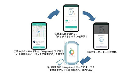 バスの運賃箱上部に設置された「Ringo Pass」マーク(NFCタグ)にスマートフォンでタッチすることで、乗務員のタブレット端末へ即座に利用が通知され、乗車可能となる。