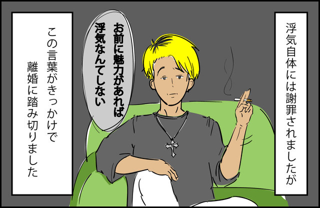 歪んでいるのは「妻が悪いのだから浮気しても自分は許される」と信じ込んでいる精神で、“外の世界”ではいっさい通用しないことを知れば、折れるしかないですよね。