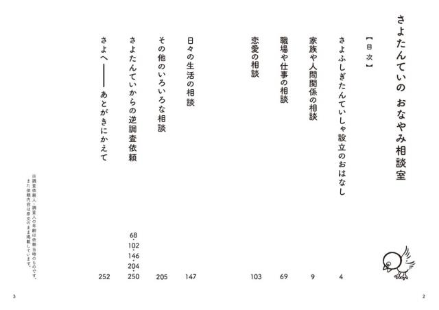 書籍「さよたんていのおなやみ相談室」では、厳選した依頼解決を項目別に一挙掲載しています。さよたんていの芯をついた名回答に、思わず笑顔になったり、ふと考えさせられたりするはず。今、お悩みがある人もない人も、ぜひ読んでみてくださいね。