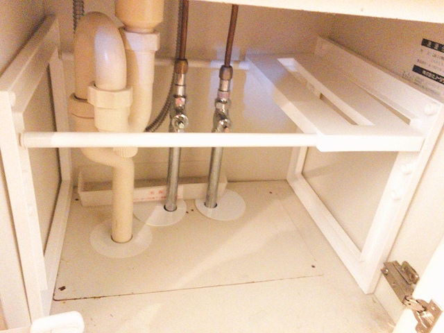まずはフリーラックを取りつけます。フリーラックの足を1本、水道管の奥へと入れ、そのあと左右の脚を固定します。