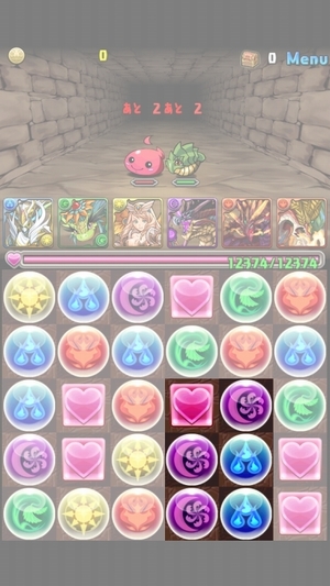 ドロップを消すと残ったドロップが重力に従って落下し、空いた部分には上からランダムにドロップが降ってくるという仕組みです。同じターンに連続で消すとコンボとなり、攻撃力がどんどん上昇します。