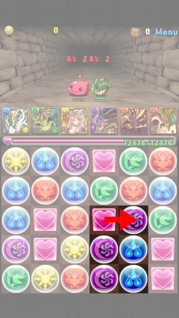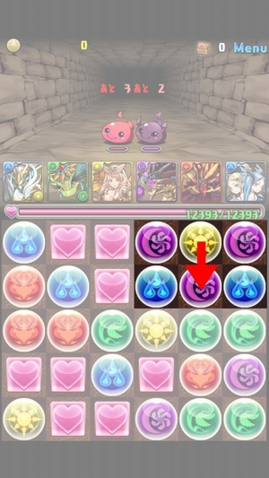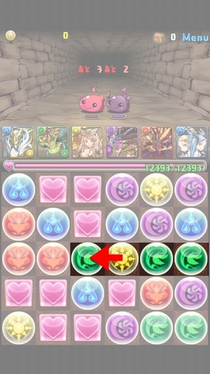 先ほどと同じく1つだけドロップを動かせば同じ色が3つそろうパターン。これはもっとも簡単なので絶対にマスターしてください。コツは先ほど書いた通り、そろえたい色のドロップではなく、移動先のドロップを動かして誘導してやること。特に難しいこともなく1コンボゲットできるのでラッキーです。