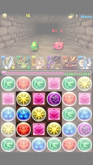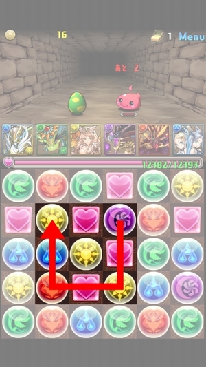 斜めに3つある場合は、こんな風に動かして真ん中の列にそろえます(動かすのは紫ドロップでなくてもいい)。この場合だと黄ドロップが横に3つ並ぶことになりますが、横に向かって動かして縦に3つ並ぶようにしてもOK。