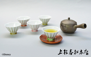 清水焼の「組湯呑」は、くまのプーさんたちが100エーカーの森で過ごす風景を、伝統的な陶磁器への染付に使用される青藍色「呉須」を使い、濃淡で奥行を表現。