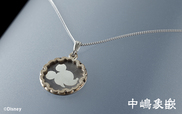 「カサネシルバーペンダント」は、京象嵌独特の「布目象嵌」の手法を使い、ステンレスのベースにシルバーのミッキーシルエットを施しました。
