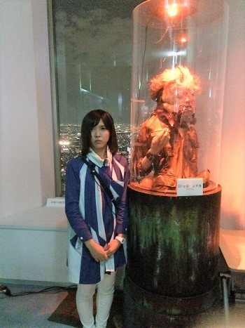 美しい夜景が見られる廊下で、少し気分を回復……と思ったが、ここにもゾンビの展示がある。上半身が剥き出しで展示されていて、かなりビックリする。