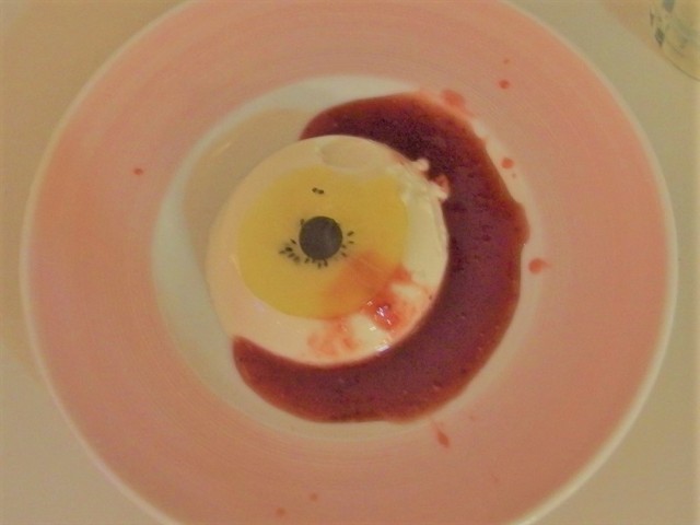 せっかくなので「目玉パンナコッタ」を食べてみる……。見かけはかなりインパクトがあるが、味は良かった。黒目はビターなチョコレート。