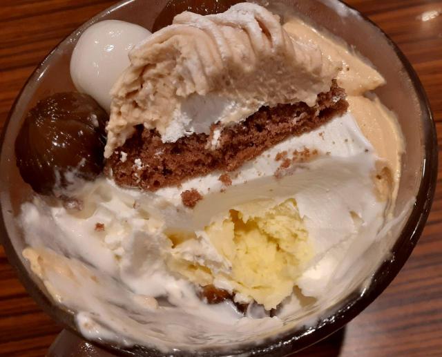 側に鎮座する大粒の栗と合わせて食べると、うん、普通にうまい。そしてそれ以上に白玉の主張がすごい! 栗と白玉ってちょっと意外な組み合わせな気もしますが、マロンクリームともっちもちの白玉の相性も、なかなかいい感じ。順調にお腹にも溜まっていきます。