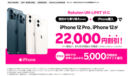 初めてRakuten UN-LIMITに申し込み、期間内に「Rakuten Link」による発信で10秒以上通話すると、楽天ポイント(期間限定ポイント)で5000ポイントプレゼントする「初めてお申し込みでだれでも5,000円相当分ポイント還元」を実施中。さらに、端末購入と回線契約を同時または同日(48回払いのみ)に行い、一括払い・24回分割払いの場合は決済時に2万2000円割り引き、48回払いのiPhone アップグレードプログラム加入時も2万円相当をポイント還元する「他社から乗り換え(MNP)でiPhone割引キャンペーン」を実施している。