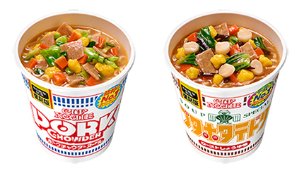カップヌードル 復刻版ポークチャウダーヌードル ビッグ、カップヌードル 復刻版ブタホタテドリ ビッグともに、カップヌードルの発売50周年を記念した特別商品で、1983年7月発売の「カップヌードル ポークチャウダーヌードル」と、1991年8月発売の「カップヌードル ブタホタテドリ ローストしょうゆ味」を、ビッグサイズで再現した復刻商品。