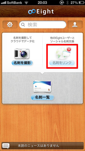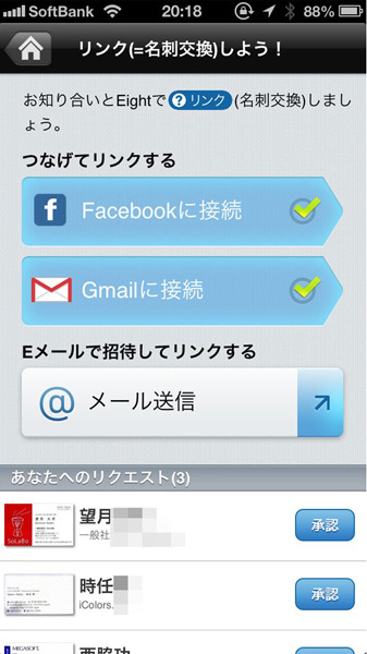 アプリをFacebookに接続しておくことで、Eightユーザーから名刺交換のリクエストがくるので、承認して名刺一覧に登録しておきましょう。