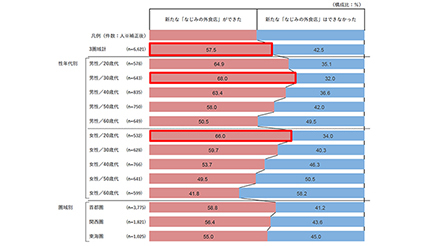 性年代別では、30代男性の68.0%が新たな「なじみの外食店」があると答えており、20代女性でも66.0%が新たな「なじみの外食店」があると回答している。