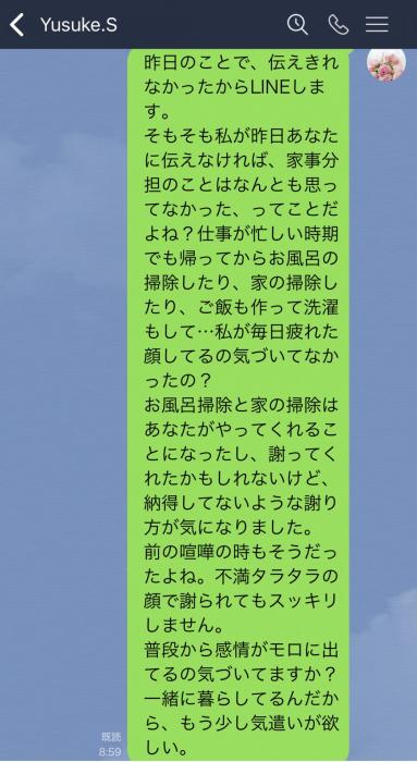もしかしたら、妻の中ではモヤモヤが残る幕引きだったのかもしれませんが、以前の喧嘩のことや普段の不満を追加で乗せた長文LINEは少しやり過ぎかもしれません。