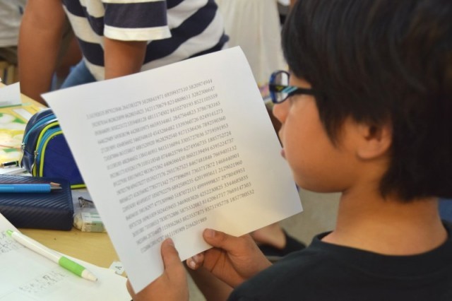 そのひとつが、円周率暗記バトル。円周率1000桁が書かれた紙が渡され、短時間でどれだけ暗記できるかを競うものです。みんな手元のプリントを見て、ものすごい集中力で数字を覚えていきました。