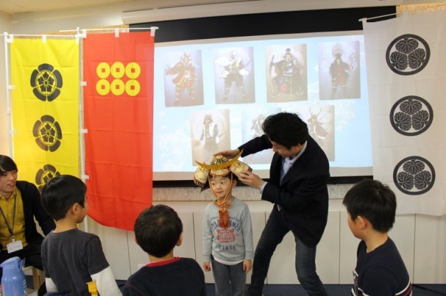 兜を試着して、気分は戦国武将! 子どもたちのテンションが上がる「戦国武将編」。