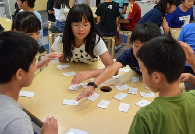 子どもたちが夢中になった「図形カルタ」。「三方四面体」といった珍しい図形の名前と形をあっという間に覚えてしまいました。