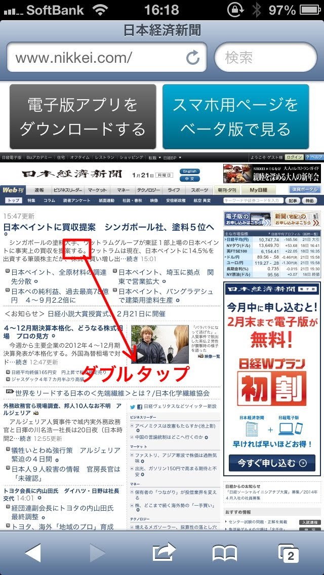 拡大したい部分をダブルタップすると、最適なサイズで拡大してくれます。再度ダブルタップをすると元のサイズに戻ります。