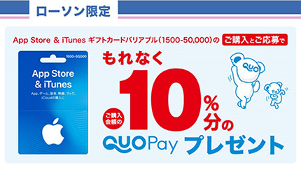 クオカードは9月27日に、同社が展開するデジタルギフト「QUOカードPay(クオ・カード ペイ)」がもらえる「App Store & iTunes ギフトカードご購入で10%分のQUOカードPayプレゼントキャンペーン」を、ローソンにて開始した。