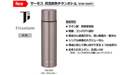 「サーモス 真空断熱チタンボトル」(FJN-500T)は、同社が長年培ってきたステンレス製魔法びんの技術を活かして約14年ぶりにリニューアル登場する。従来モデルよりも大容量ながら、軽量・コンパクトさを実現した真空断熱チタンボトル。