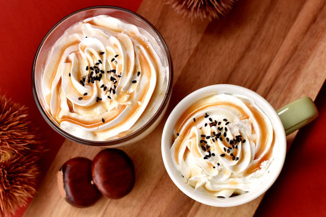 「棒ほうじ茶」マロンペーストを加え、黒胡麻をトッピングした、秋の味わいが詰まったラテをご紹介します。