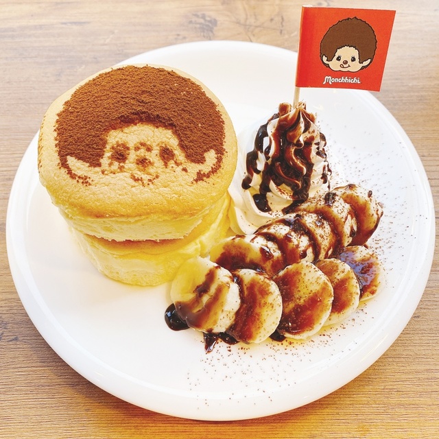 今回登場したパンケーキには、モンチッチの愛くるしいキャラクター像がデコレーションされ、モンチッチの大好きなバナナを使用し、しっとりした食感と濃厚な味わいのチョコソースが相性抜群です。