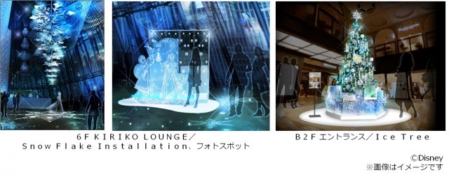 6階「KIRIKO LUNGE」の天井高約27mの大吹き抜けに、エルサの魔法をイメージしたインスタレーションによる、雪の結晶が舞うような幻想的な空間が登場します。