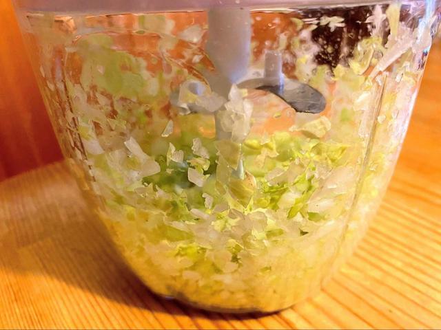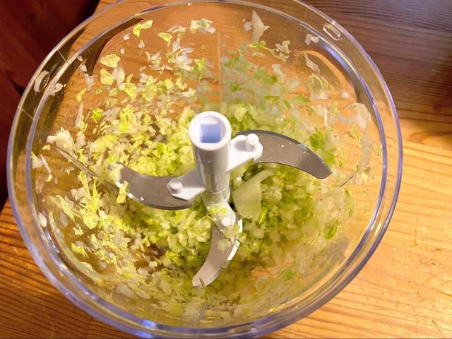 今回は、白菜をみじん切りにしてみます。葉を容器に入るくらいの適当な大きさにざくざく切ったら、どんどんみじん切り器に入れます。