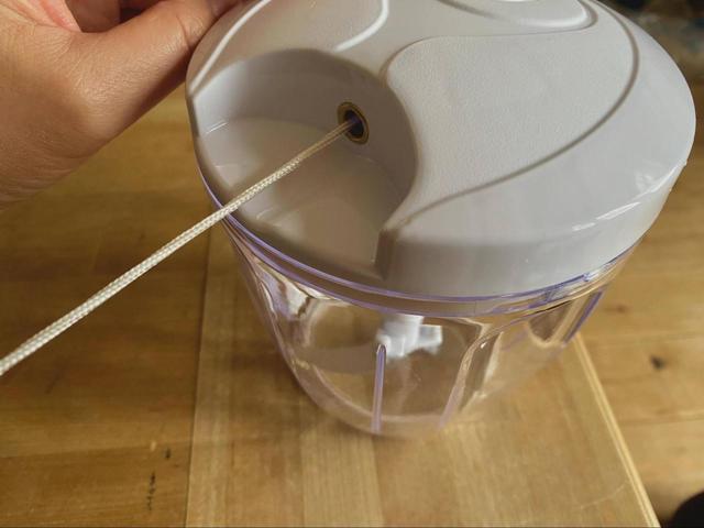 引っ張ると、鋭い刃が高速回転!最初は強めに引っ張る必要がありましたが、だんだんと力も要らなくなり、10回も引っ張ると、あっという間に白菜は粉々のみじん切りになりました。