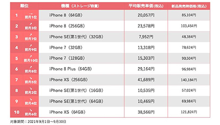 Belongは10月6日に、同社が運営する中古スマートフォンのECサイト「にこスマ」における、9月の中古iPhone/機種別販売数ランキングを発表した。