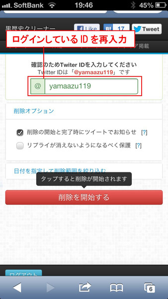 サイトにアクセスしたら右下の「ログイン」ボタンをタップ。Twitterのアカウント情報を入力してログインします。メイン画面では再びTwitterのIDを入力し、「削除を開始する」をタップして進めます。なお、この画面では日時を指定して削除範囲を絞り込んだり、リプライの保護の設定も可能なので、必要に応じて設定していきましょう。
