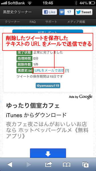 削除は画面の指示に従って、「OK」をタップしていけば進んでいきます。削除が完了すると結果画面が表示されます。結果画面の「URLをメールで送信」をタップすると、削除したツイートをテキストファイルとしてまとめたURLリンクを貼られたメールを作成できます。自分に送ってあとで保管しておきましょう。もちろん、受け取らずに記憶からも抹消してしまうのも選択肢のひとつです。