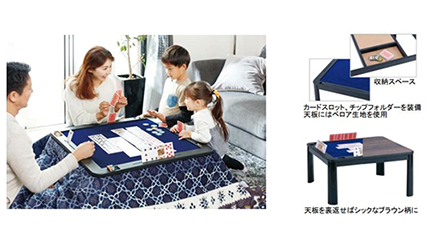 「ゲーミングこたつ」は、カードゲーム用のカードスロットや、チップフィルターを備えるとともに、カードやチップを扱いやすいベロア生地の天板を採用する。天板の下には、カードやチップの収納スペースを備えており、天板は通常のこたつとしても使えるよう、リバーシブル仕様となっている。