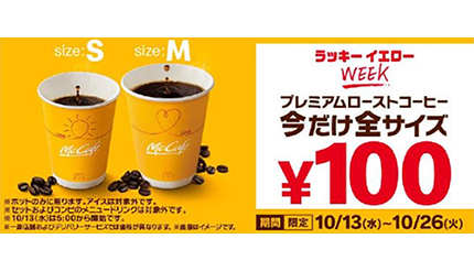 マクドナルド、10月13日~26日の期間「プレミアムローストコーヒー(ホット)」全サイズを税込100円に
