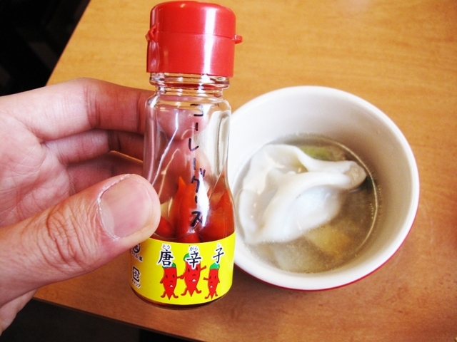 ちょっと味に変化が欲しくなったら、テーブルにある「コーレーグース」がオススメです。コーレーグースとは、唐辛子を泡盛に漬けた沖縄の調味料。沖縄そばなどにかけるのが一般的ですが、『ちぇけなべ』のあっさり塩味スープにもバツグンに合う! 特に水ギョーザとの相性がすばらしい。この日は取材なのでガマンしましたが、飲んべえとしてはちょっと一杯飲みたくなってきますなあ……(お酒やおつまみメニューもあります)。