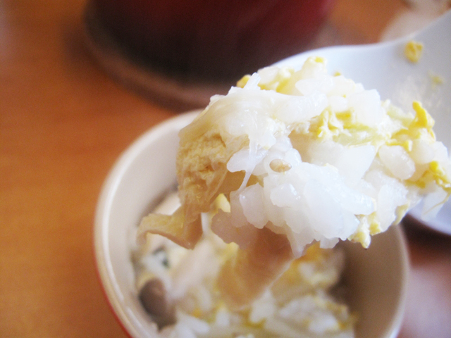 鍋の残りが少なくなってきたら、お楽しみのシメの時間! シメのメニューは雑炊とラーメンから選べます(裏メニューもあるとか……!?)。このスープだとラーメンも間違いなくうまいと思いつつ、今回は雑炊をチョイス。いったん鍋を厨房に戻して、鍋奉行・杉本さんがベストの雑炊を作ってくれます。ほどなくして雑炊の完成! これはもう、うまいに決まってるでしょう! スープがじんわり染み込み、ふんわり卵でとじられた雑炊……ハフハフ……むうー、至福。