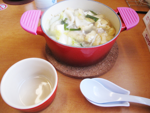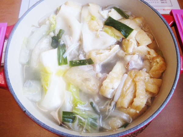 どーん! これが『ちぇけなべ』だっ!! ……見た目は特に変わったところはなく、普通においしそうな鍋という感じ。でもル・クルーゼの鍋で出てくるだけで、いつもの鍋と雰囲気が全然違うなあ。そして予想以上にボリューミー! これで一人前750円です。