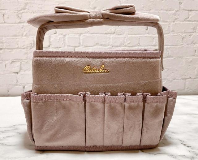 持ち手のリボンや、ベルベットのような素材、ゴールドのロゴプレートなどのデザインはもちろん、仕切り板や外・中に豊富についているポケットなど機能性の面でもGood!
