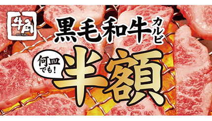 レインズインターナショナルが展開する牛角は、10月15日から31日まで、黒毛和牛カルビが何皿でも半額になる「黒毛和牛半額フェア」を実施する。ほかにも4種の肉メニュー・サイドメニュー・生ビールなどが特別価格で利用できる。