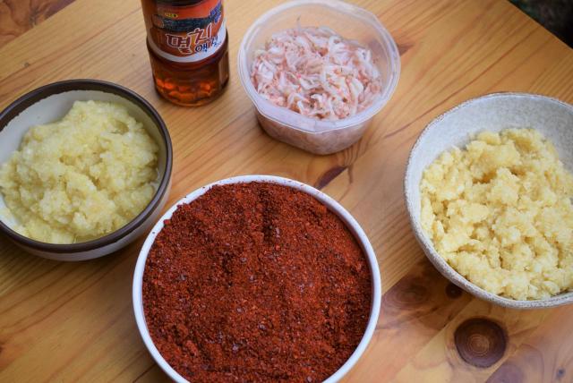 薬味の主な材料。手前から時計回りに、唐辛子粉、生姜のすりおろし、イワシの魚醤、アミの塩辛、ニンニクすりおろし