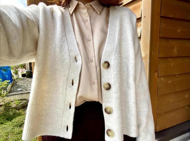 しかし筆者は、丈が長めの似たようなカーディガンを一着持っていたので、ここはあえてジャストサイズのMサイズを選びました。