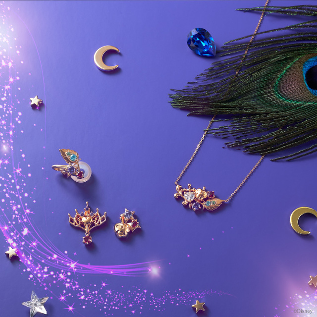 ハートのストーンは剣に、毒リンゴのメタル、クジャクの羽の中央部分には羽をイメージさせるカラーストーン、繊細にデザインされたモチーフに、鮮やかなストーンの色味をプラスしてさらに「ポムフィオーレ寮」の華やかな世界観を表現しました。