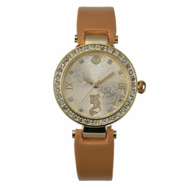 ベルの横顔と蔦模様があしらわれたゴールドカラーの文字盤の腕時計です。