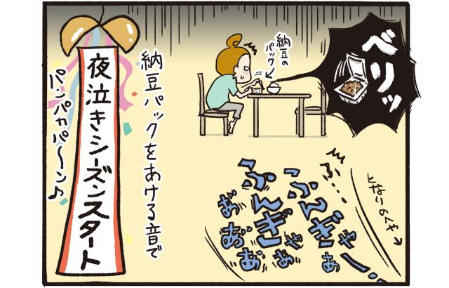 たまたま納豆のパックをあけた瞬間にまめが目覚めただけだったのか、本当に「ベリッ」というあの音で起きたのかは定かではありませんが(笑)、とにかく遂に、恐れていた「夜泣きシーズン」がスタート。