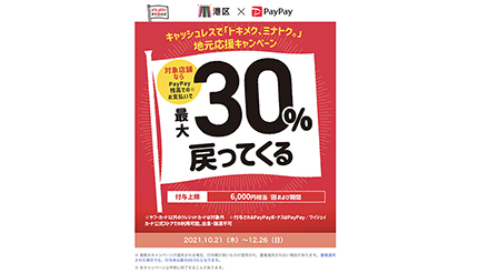 PayPayは、店頭ポスターなどキャンペーンツールを掲出する東京都港区内のPayPay加盟店でPayPay決済の30%が戻ってくる「キャッシュレスで「トキメク、ミナトク。」地元応援キャンペーン」を2021年10月21日から12月26日に実施する。