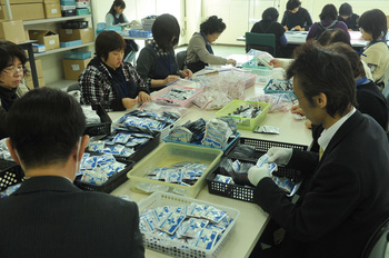 いまや、1ヵ月に数10万セットを、しかも定期的に作る製品になっているのだから、袋詰めの作業などは工場で機械によって行うほうが早くて安くできるはずだ。被災地に作りかけの製品を送り、引き取る送料も馬鹿にならない。しかし、和氣さんはしばらくはまだ手作業で、と考えている。製品コンセプトの柱のひとつが被災者の雇用創出にあった。そこは継続させて、しかし被災地のみでは分量的に最終工程をこなしきれない。そのぶんは、本社がある平塚、あとは八王子など何ヵ所かで、やはり従来通りの手作業で袋詰めを行うことにするという。