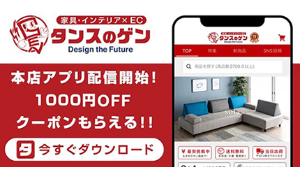 主要ECモールに出店するタンスのゲンは、ネットショップ「タンスのゲン本店」の公式アプリ「タンスのゲン本店アプリ」を10月21日にリリースした。