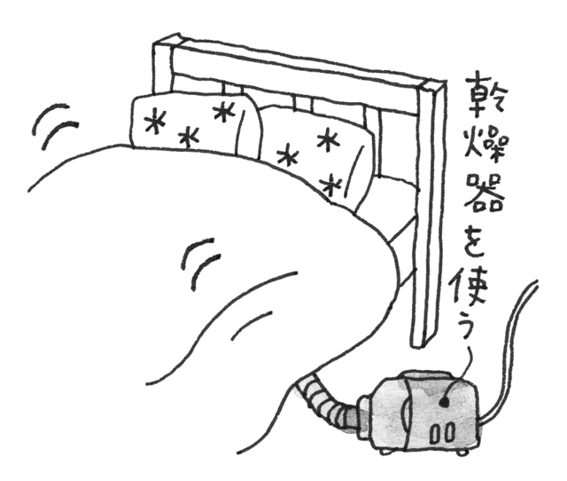 3)花粉が飛びやすい時期に布団を干さないで、布団乾燥機を使うのもよい。干した場合は、マスクをして布団をしっかり叩いてから中へ。
