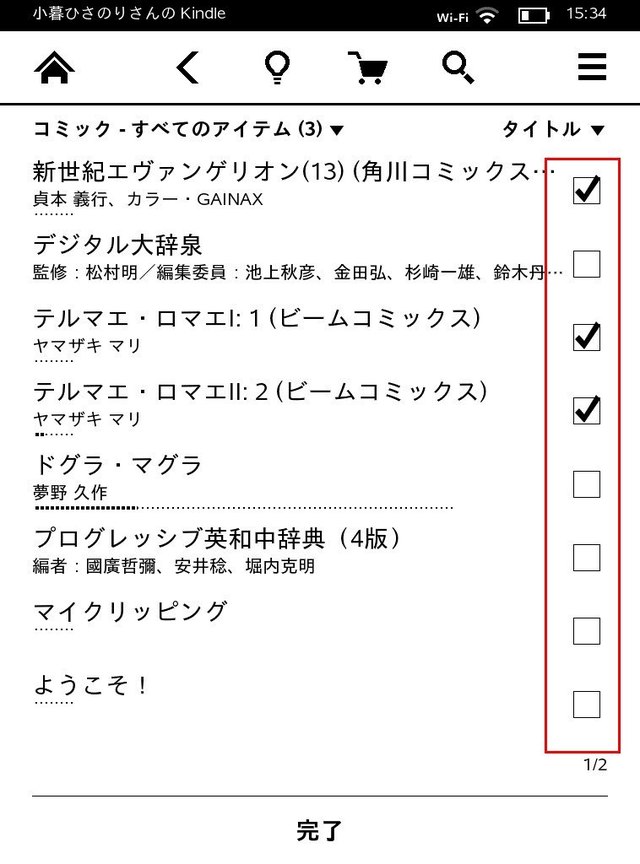 コレクションの名前を入力し、その中に入れたい書籍にチェックをして「完了」をタップします。