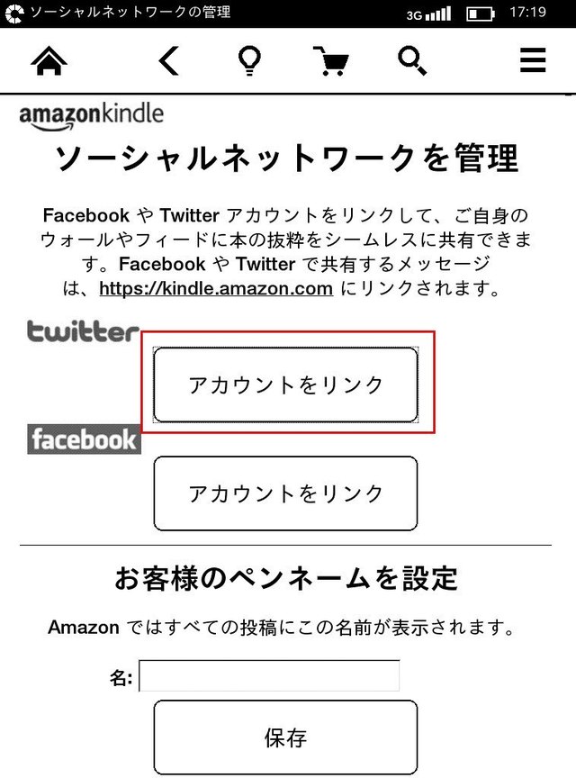 「≡」→「設定」→「辞書オプション」→「ソーシャルネットワーク」とタップ。Twitterの「アカウントをリンク」をタップ。