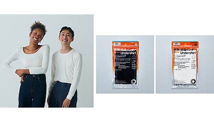 新開発の素材を使用した、肌の湿度を吸って発熱し、しっかり保温する機能性インナーREHEATは、紳士用にクルーネック(黒・白)、Vネック(白)の2タイプ、婦人用にラウンドネック(黒・白)の1タイプを、秋冬限定で発売する。